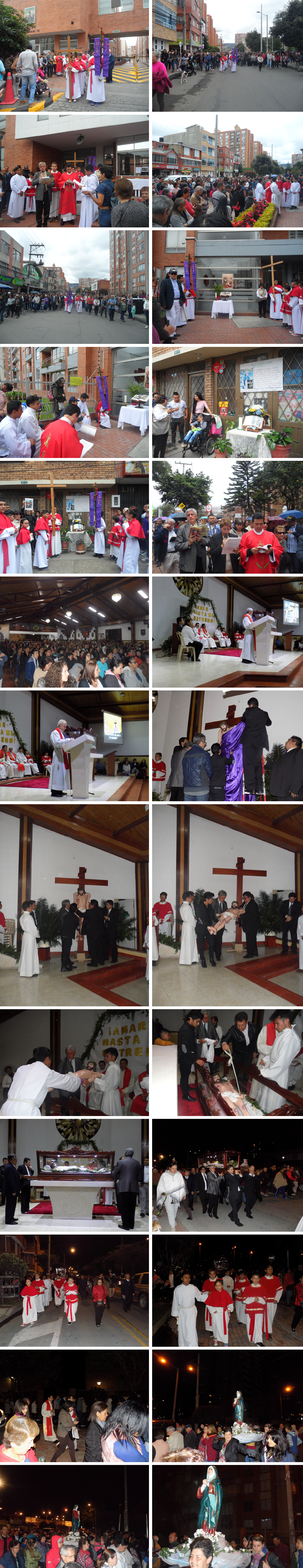 La jornada del Viernes Santo en la Parroquia San Jerónimo Emiliani se vive con gran devoción desde las primeras horas del día hasta entrada la noche. La tarea espiritual comenzó a las 10:00 de la mañana con el Vía Crucis, meditado por las principales calles vecinas al Templo, presidido por el Diácono Permanente Luis  Ferrucho, un dúo musical y una multitud de feligreses que a pesar del 'frío bogotano' acudieron en gran cantidad para poder acompañar los últimos pasos del Divino Salvador camino a la crucifixión.
