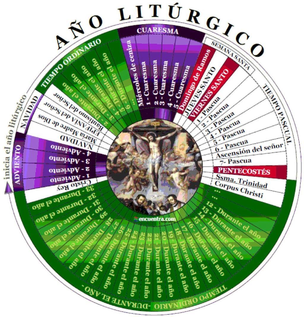 Es el tiempo a través del cual celebramos el Misterio de Nuestra FE mediante SIGNOS y SÍMBOLOS, teniendo como CENTRO el Misterio Pascual. Tiene una duración de 52 semanas, su inicio y término NO coincide con el del AÑO CIVIL o CALENDARIO. Comienza con el PRIMER domingo de Adviento, (para este año, 2019 es el día 1 de diciembre) y termina con la celebración de la Fiesta de Cristo REY (el 22 de noviembre de 2020).