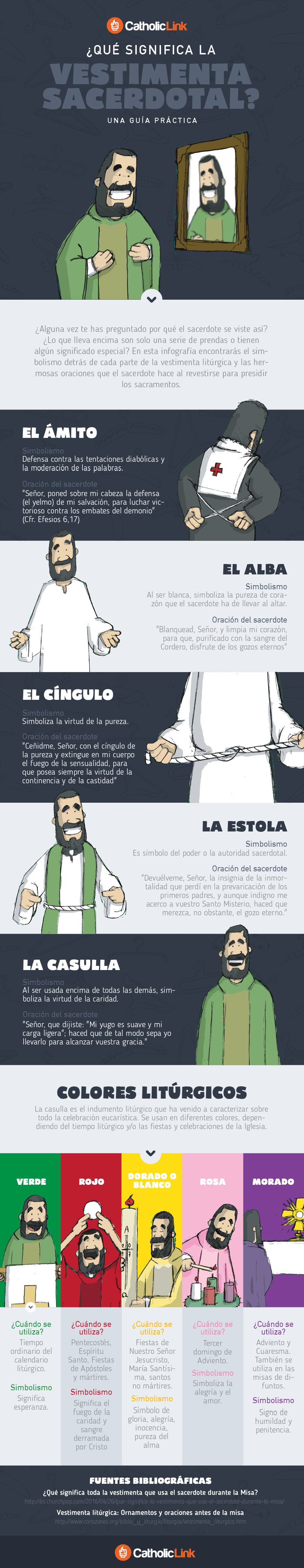 Esta infografía que hemos preparado nos explica cada una de estas piezas y su significado. Que la próxima vez que estemos en presencia de un sacerdote, y sobre todo en misa, observemos no solo los colores que nos recuerdan los tiempos litúrgicos, sino la respuesta generosa que estos hombres han dado a la llamada de Dios.