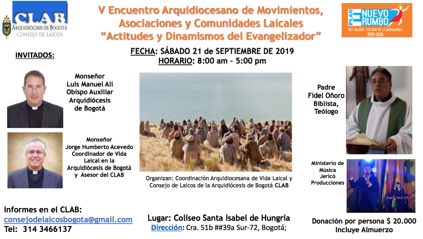 Centro de información Yo quiero Noticias Boletines Eventos Artículos Canonización Mensajes del Señor Cardenal Cartas pastorales Homilías Mensajes La voz del pastor Documentos del Vaticano NoticiasActitudes y dinamismos del evangelizador18 de Septiembre de 2019Encuentro anual de los laicos provenientes de las diferentes asociaciones y movimientos laicales de la arquidiócesis de BogotáDirigido a: Miembros de movimientos y… Like 0 Dislike 0 Noticias relacionadas Video del papa - noviembre de 2025 La Iglesia Samaritana que abraza a Bogotá #Destacado