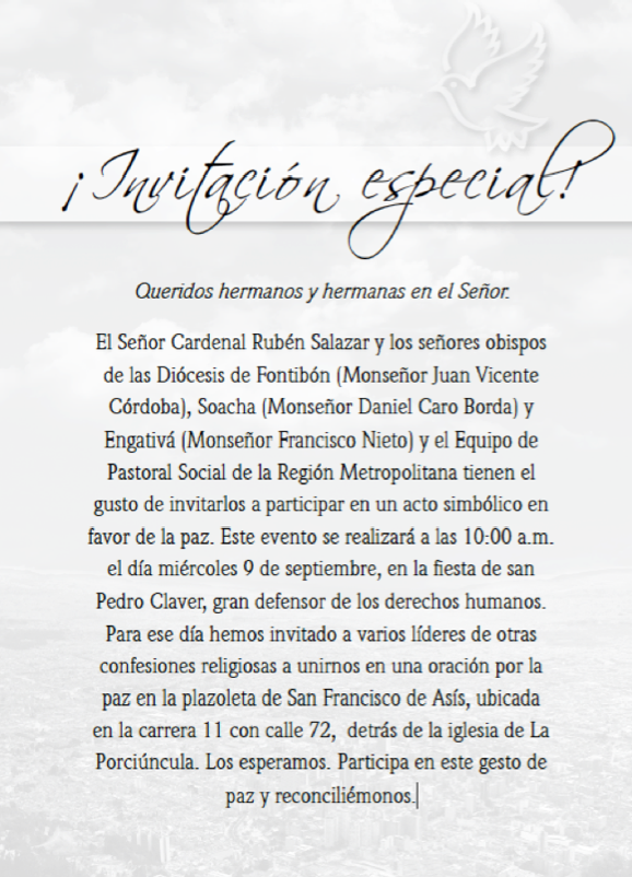 El año pasado, el Señor Arzobispo de Bogotá, el Gran Rabino Judío y el Sheikh Musulmán exhortaron de manera conjunta a todos sus fieles a orar por la paz. En tal sentido, colocamos en manos del Altísimo todas esas actividades y propuestas como un compromiso de fe, para que por la reconciliación lleguemos a la paz. Es por esto que se invita el hoy 9 de septiembre de 2015, a las 10:00 am a un acto interreligioso, ecuménico e interdenominacional a los líderes religiosos para orar por la paz y mostrar la solidaridad con las personas más necesitadas. Este evento se realizará en el salón conjunto de la parroquia La Porciúncula en la dirección Cra 11 No. 72-82. Es abierto a todo el público que desee asistir.