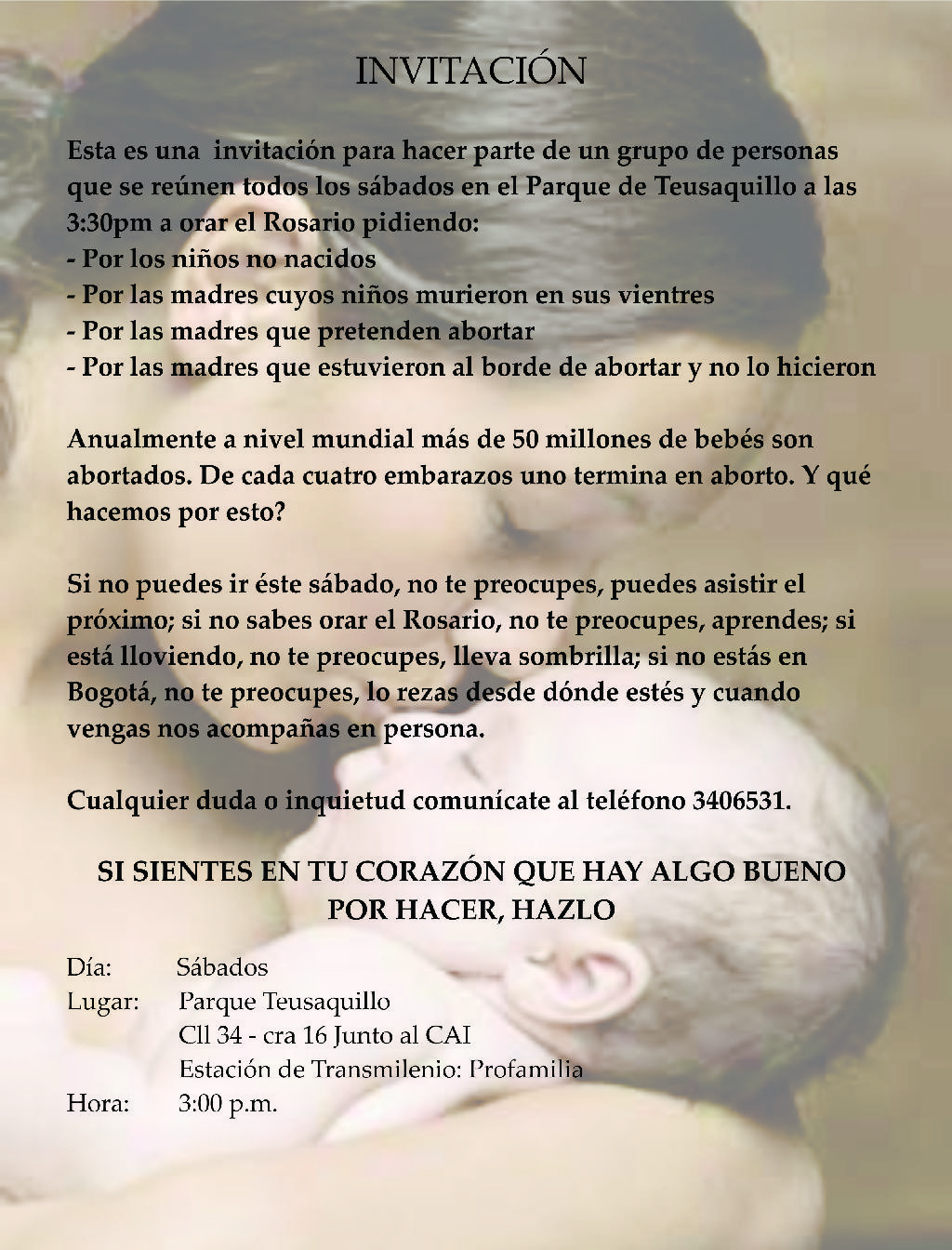 Este año, inspirados por el Espíritu Santo junto con otros grupos próvida se empezó a ofrecer el Rosario frente al abortorio más grande del país, desde el 5 de julio seguimos comprometidos todos los primeros sábados de mes, consagrados a la Virgen María orando por la conversión de los abortistas y la salvación de los bebés y sus madres.