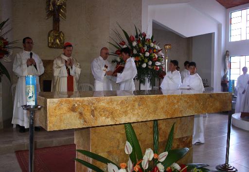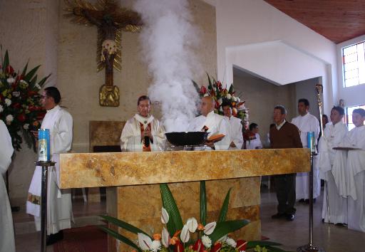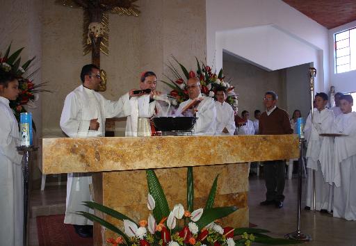 Luego el Obispo lo unge con el santo crisma (aceite) las cinco cruces grabadas en la piedra, que representan las cinco llagas de Nuestro Señor Jesucristo” e inciensa en repetidas ocasiones quedando este altar bendito allí se introducen las reliquias.