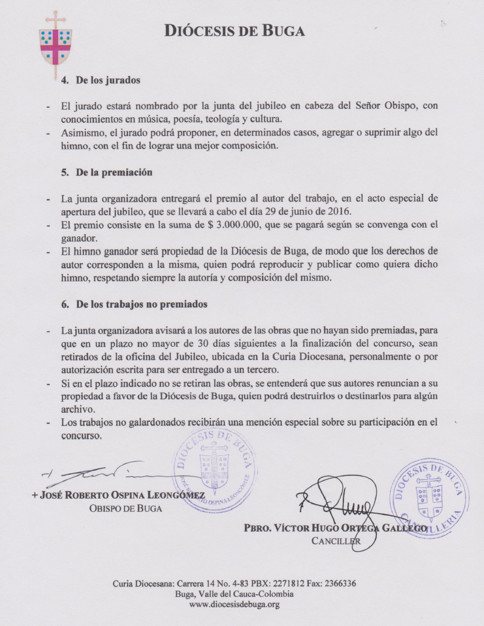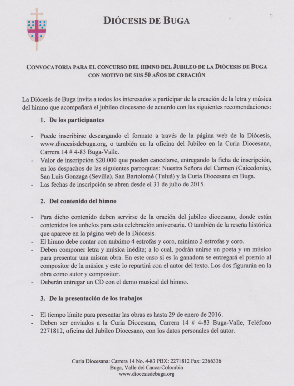Centro de información Yo quiero Noticias Boletines Eventos Artículos Canonización Mensajes del Señor Cardenal Cartas pastorales Homilías Mensajes La voz del pastor Documentos del Vaticano NoticiasConvocatoria para el concurso del himno del Jubileo de la Diócesis de Buga con motivo de sus 50 años de creación9 de Octubre de 2015 Like 0 Dislike 0 Noticias relacionadas ¡Inscríbete ahora! Informamos ‼️🚨Denunciemos