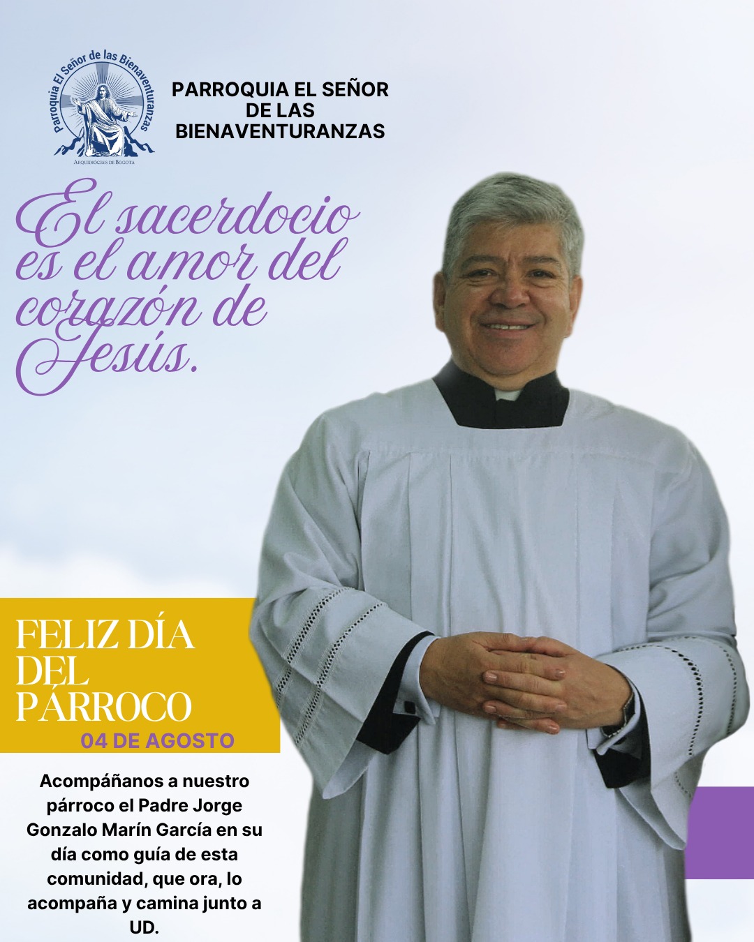 A nuestro párroco el Padre Jorge Gonzalo Marín García le deseamos mucha sabiduría, cariño y fraternidad, que el ejemplo de San Juan María Vianney inspire su labor diaria y fortalezca su misión de llevar esperanza y amor a cada rincón.