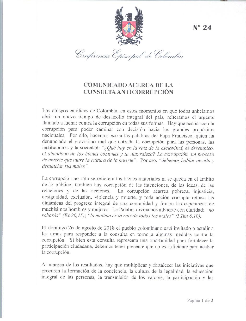 Centro de información Yo quiero Noticias Boletines Eventos Artículos Canonización Mensajes del Señor Cardenal Cartas pastorales Homilías Mensajes La voz del pastor Documentos del Vaticano NoticiasIglesia católica anima a luchar contra la corrupción22 de Agosto de 2018Los obispos católicos del país hacen un llamado a todos los colombianos a luchar contra la corrupción en todas sus formas. Así lo manifestaron, a través de un comunicado… Imagen: https://mioriente.com/ Like 0 Dislike 0 Noticias relacionadas Mensaje de Mons. Edwin Vanegas Cuervo, obispo auxiliar de Bogotá La Santa Misa en Semana Santa La Arquidiócesis de Bogotá celebra el nombramiento de Monseñor Paolo Rudelli en la Santa Sede