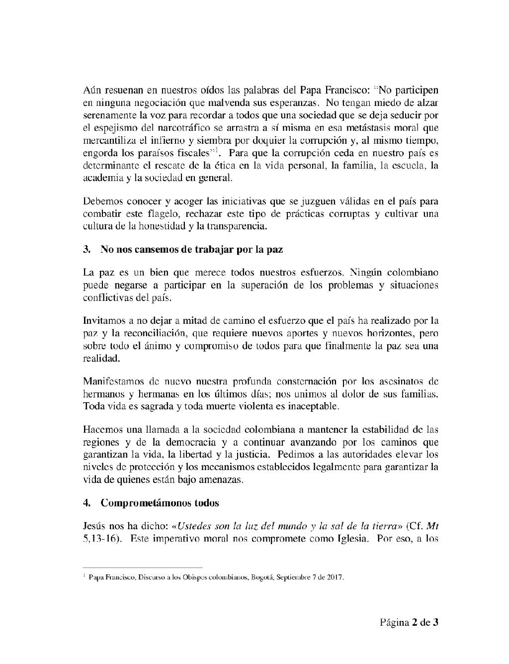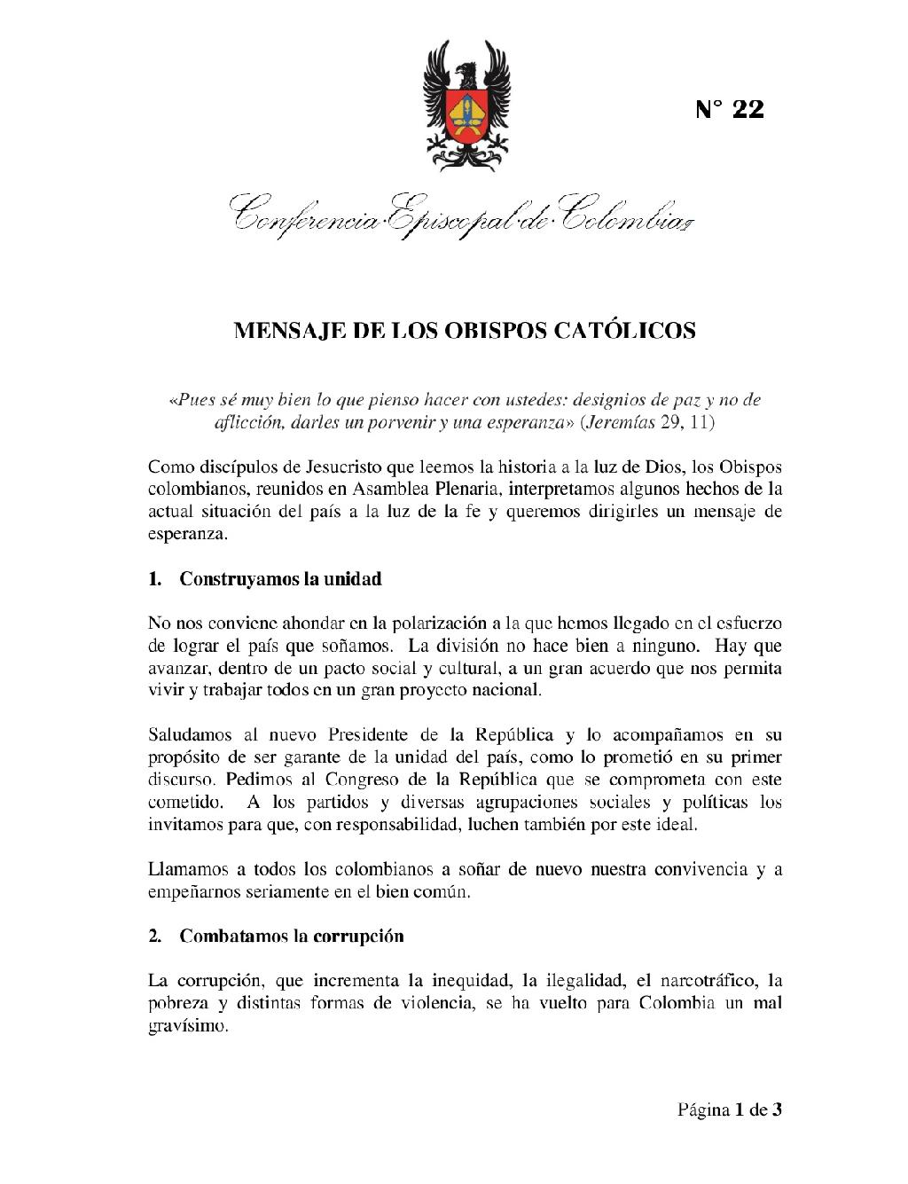 Centro de información Yo quiero Noticias Boletines Eventos Artículos Canonización Mensajes del Señor Cardenal Cartas pastorales Homilías Mensajes La voz del pastor Documentos del Vaticano NoticiasObispos invitan a construir unidad, combatir la corrupción y trabajar por la paz6 de Julio de 2018Tras concluir la CVI Asamblea Plenaria del Episcopado Colombiano, a través de un mensaje, los obispos del país invitaron a las nuevas autoridades y a todos los… Like 0 Dislike 0 Noticias relacionadas Mensaje de Mons. Edwin Vanegas Cuervo, obispo auxiliar de Bogotá La Santa Misa en Semana Santa La Arquidiócesis de Bogotá celebra el nombramiento de Monseñor Paolo Rudelli en la Santa Sede
