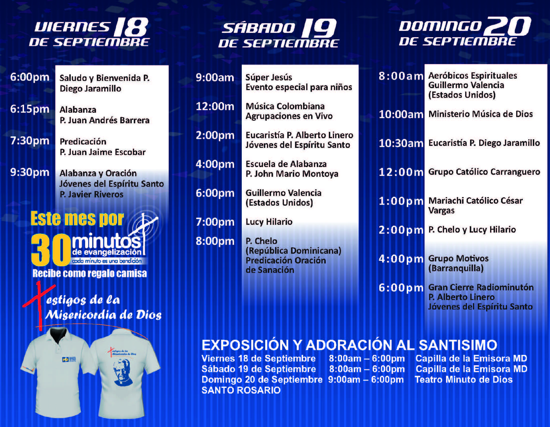 Los niños y niñas tendrán un espacio fenomenal con Súper Jesús, en el que compartirán con los niños que realizan este programa y una serie de actividades lúdicas, premios y grandes sorpresas. Además, se podrá disfrutar de buena comida en el festival gastronómico colombiano, sin embargo, lo más importante en este gran evento, es el invitado más especial, el único que puede renovar vidas: Dios Padre, Dios Hijo y Dios Espíritu Santo.