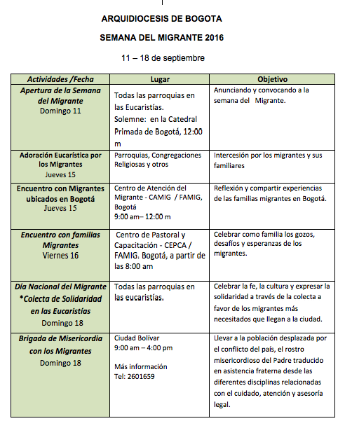 El Pontificio Consejo, en la Instrucción ERGA MIGRANTES CARITAS CHRISTI, Artículo 21 del ORDENAMIENTO JURIDICO PASTORAL, dice “Con el fin de sensibilizar a todos los fieles respecto a los deberes de fraternidad y de caridad con los emigrantes y reunir las ayudas económicas necesarias para cumplir con las obligaciones pastorales en relación con ellos, las Conferencias Episcopales y las respetivas estructuras jerárquicas de las Iglesias Orientales Católicas establezcan la fecha de una Jornada (o Semana) del Emigrante y del Refugiado, durante el periodo y en el modo que las circunstancias locales lo sugieran, aunque se desearía, en el futuro, una celebración en todas las parte en una fecha”.