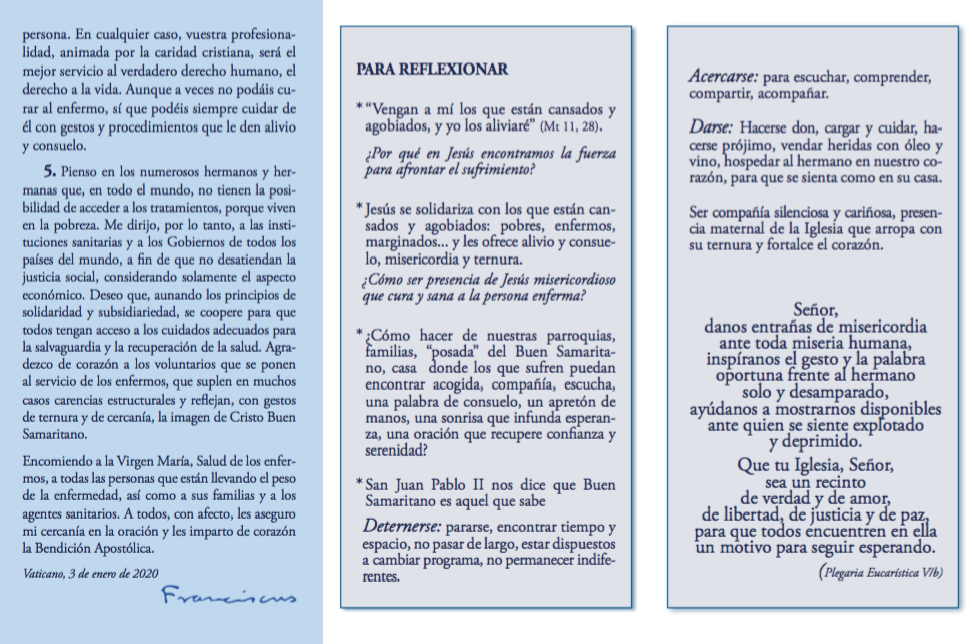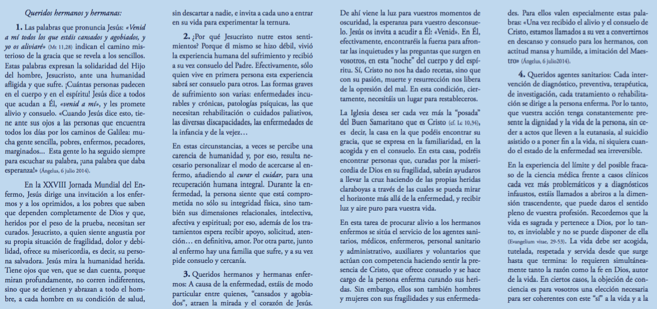 Centro de información Yo quiero Noticias Boletines Eventos Artículos Canonización Mensajes del Señor Cardenal Cartas pastorales Homilías Mensajes La voz del pastor Documentos del Vaticano NoticiasXXVIII Jornada mundial del enfermo, mensaje del Santo Padre Francisco11 de Febrero de 2020 Like 0 Dislike 0 Noticias relacionadas Video del papa - noviembre de 2025 La Iglesia Samaritana que abraza a Bogotá #Destacado